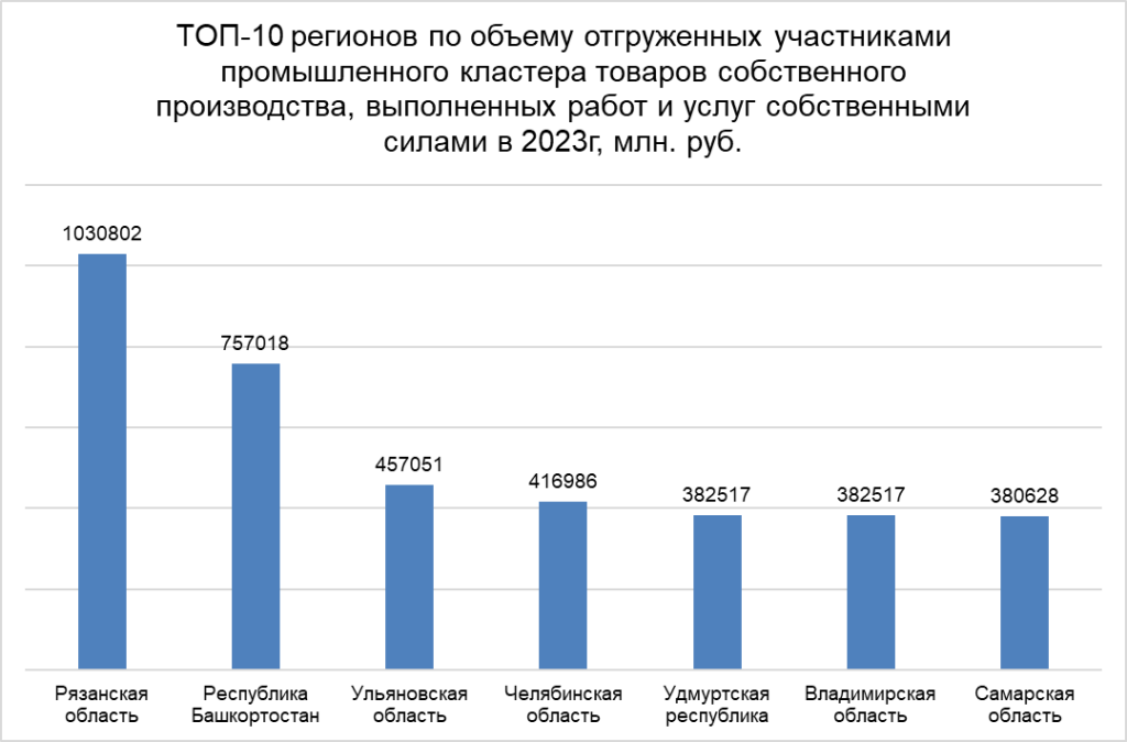 ТОП-10 регионов по объему отгруженных участниками промышленного кластера товаров собственного производства, выполненных работ и услуг собственными силами в 2023г, млн. руб.