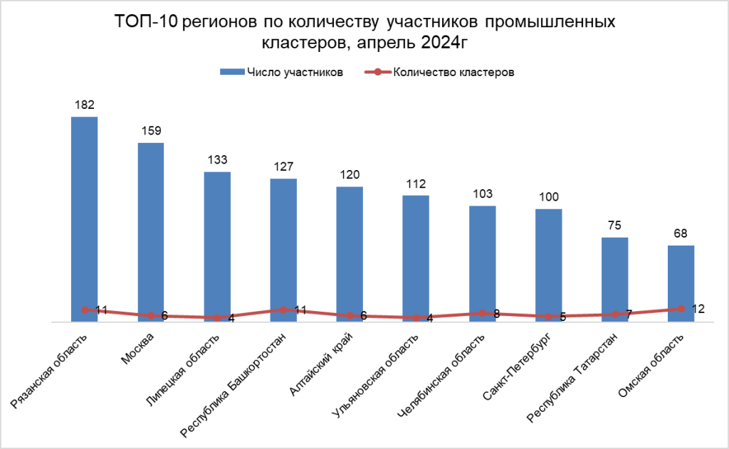 Лидерами по количеству участников промышленных кластеров стали Рязанская область (182) и Москва (159).