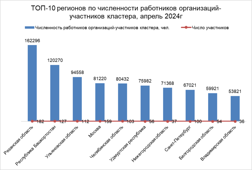 ТОП-10 регионов по численности работников организаций-участников кластера, апрель 2024г