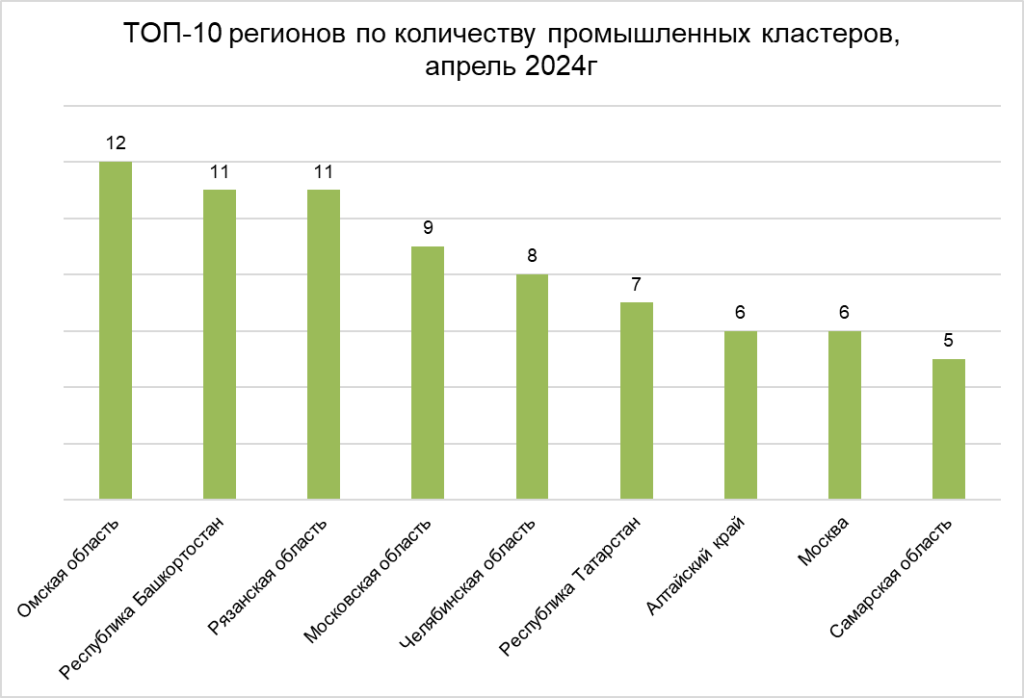 ТОП-10 регионов по количеству промышленных кластеров, апрель 2024г