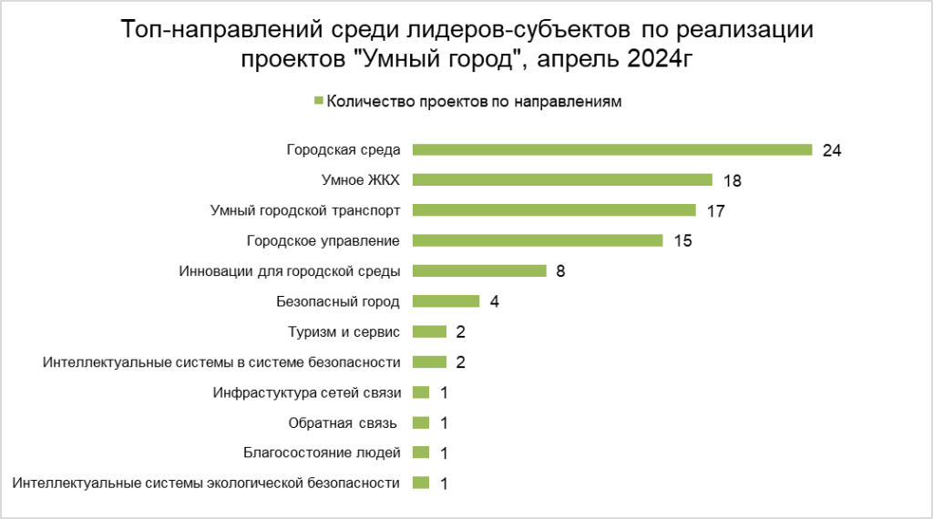 Наибольшее количество проектов реализуется по направлению «Городская среда» (24), «Умное ЖКХ» (18), «Умный городской транспорт» (17), «Городское управление» (15).