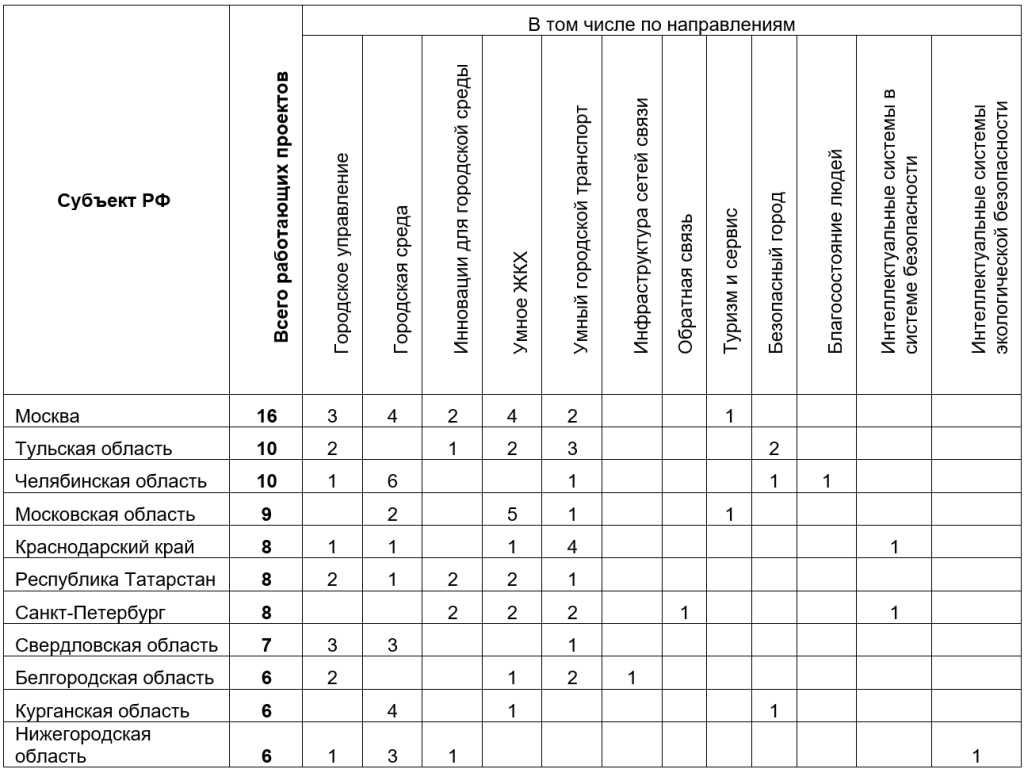 Устоявшимся лидером по реализации проектов «Умный город» является Москва, где запущено 16 программ по направлениям: