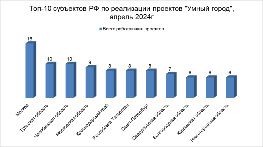 Топ-10 субъектов РФ по реализации проектов "Умный город", апрель 2024г