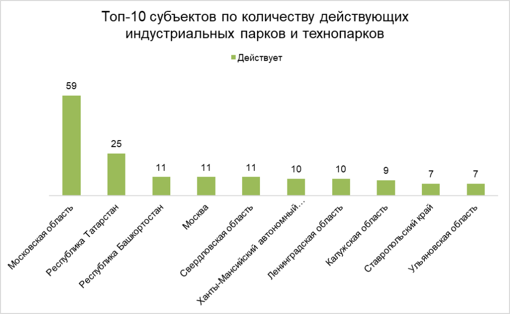 Наибольшее количество действующих парков представлено в Московской области (59) и Республике Татарстан (11).